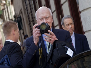 O senador americano Patrick Leahy, tira fotos com uma câmera após reunião com ministro cubano
